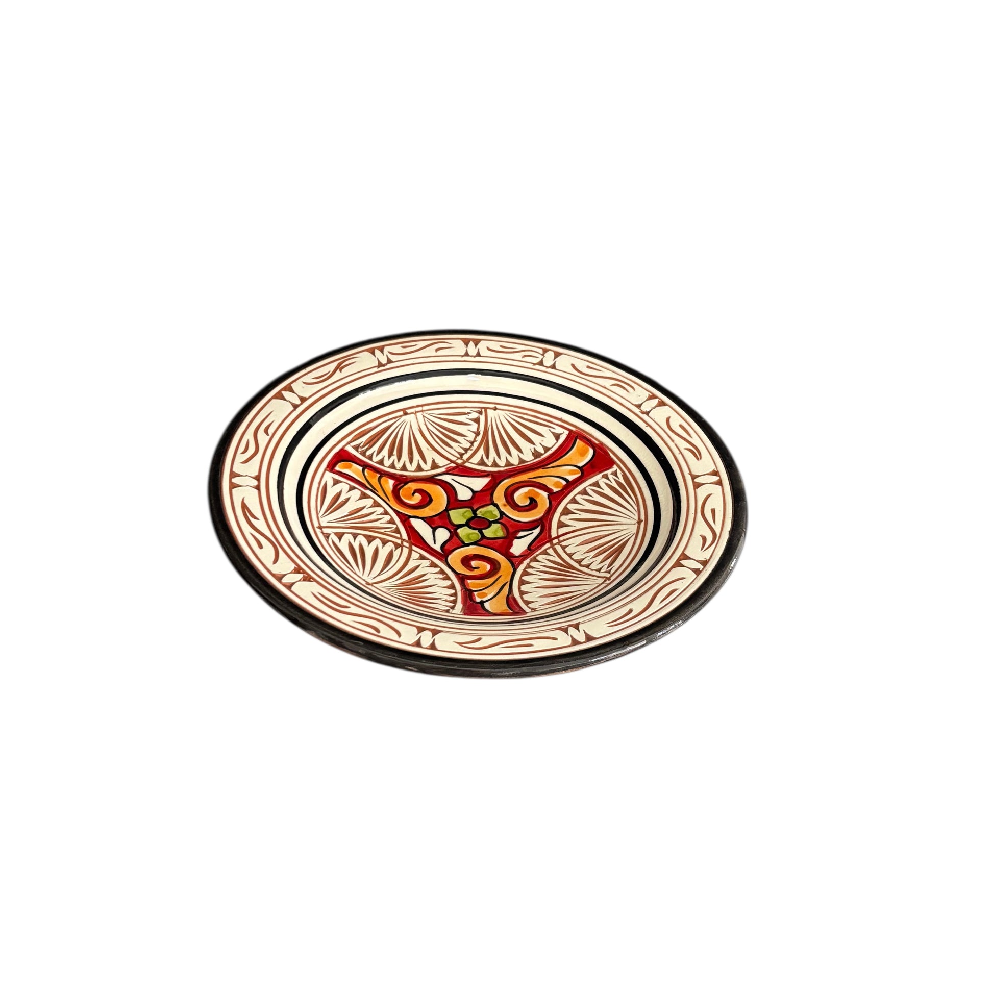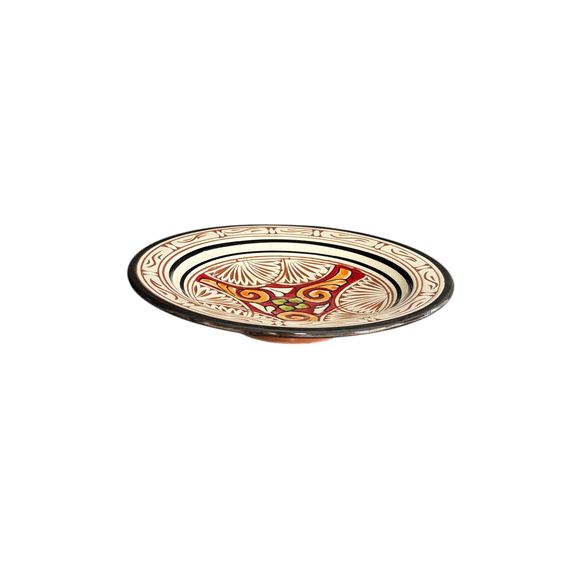 Marockansk brun/vit assiett med röda, orangea och gröna detaljer i handgjord, målad och inristad keramik.