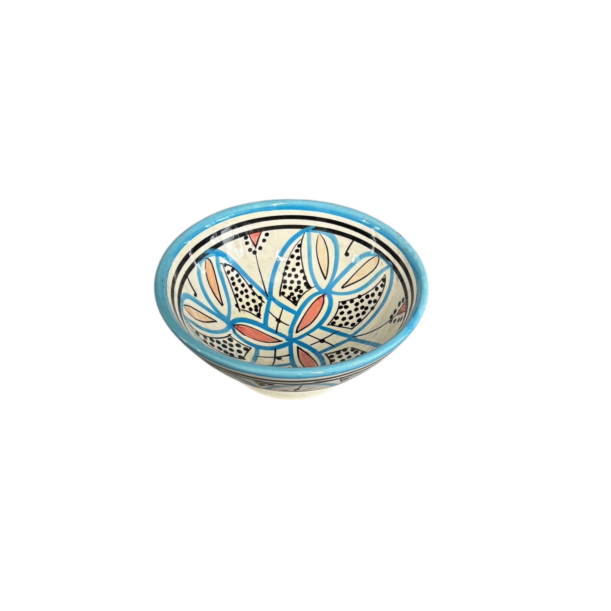 Handgjord marockansk skål i vitt med turkosa detaljer.