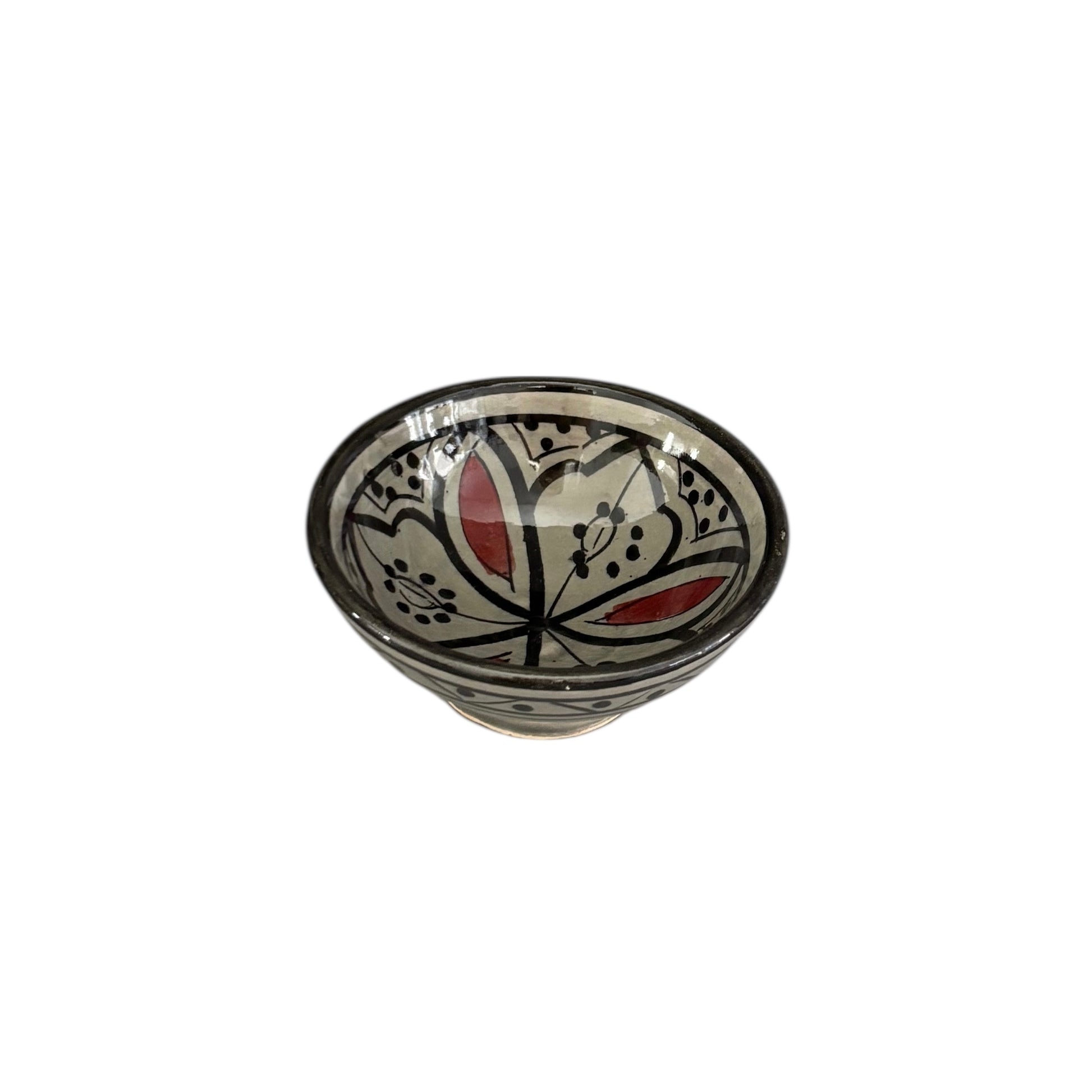 Grå handgjord marockansk skål med svarta och vinröda orientaliska detaljer.