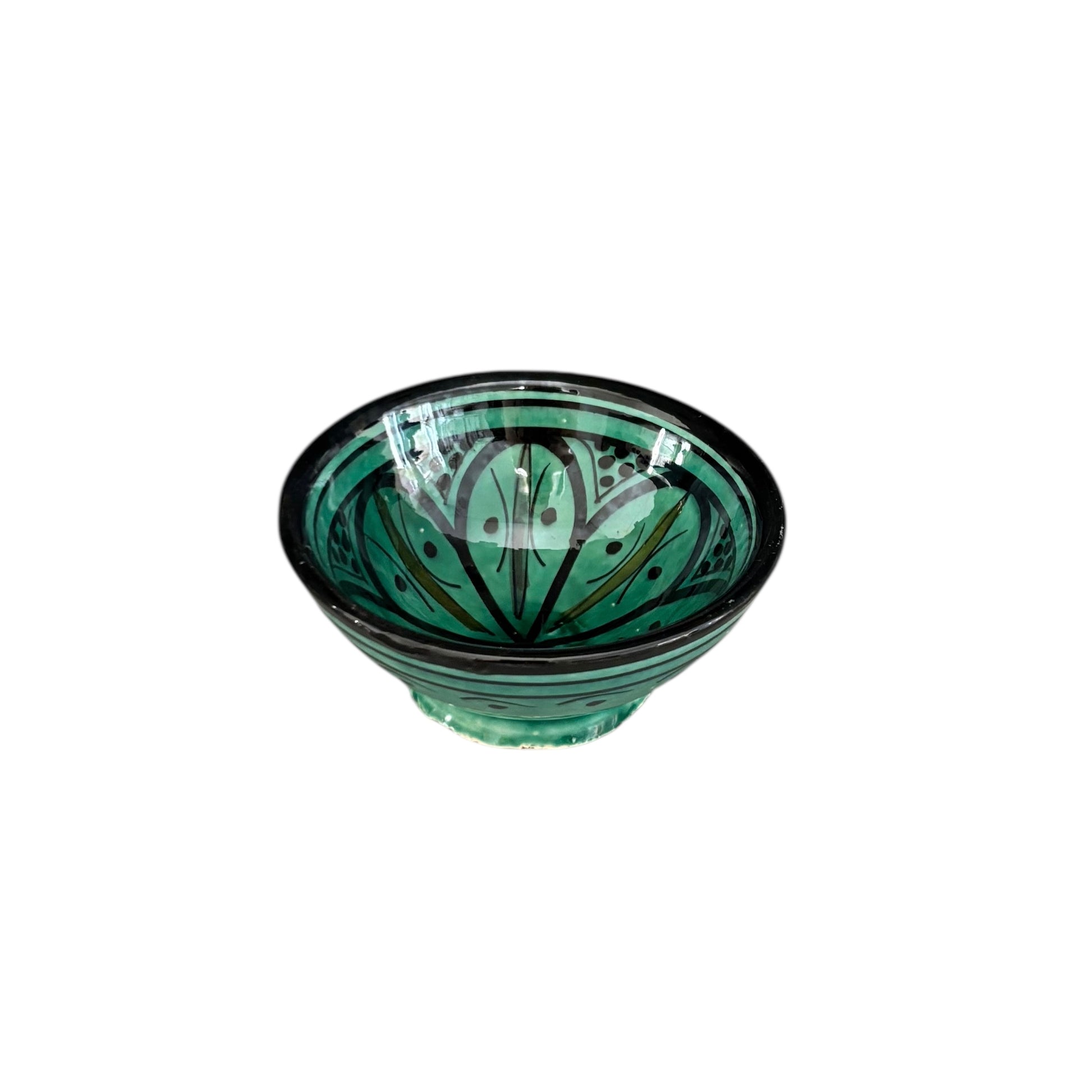 Turkos handgjord marockansk skål med svarta orientaliska detaljer.