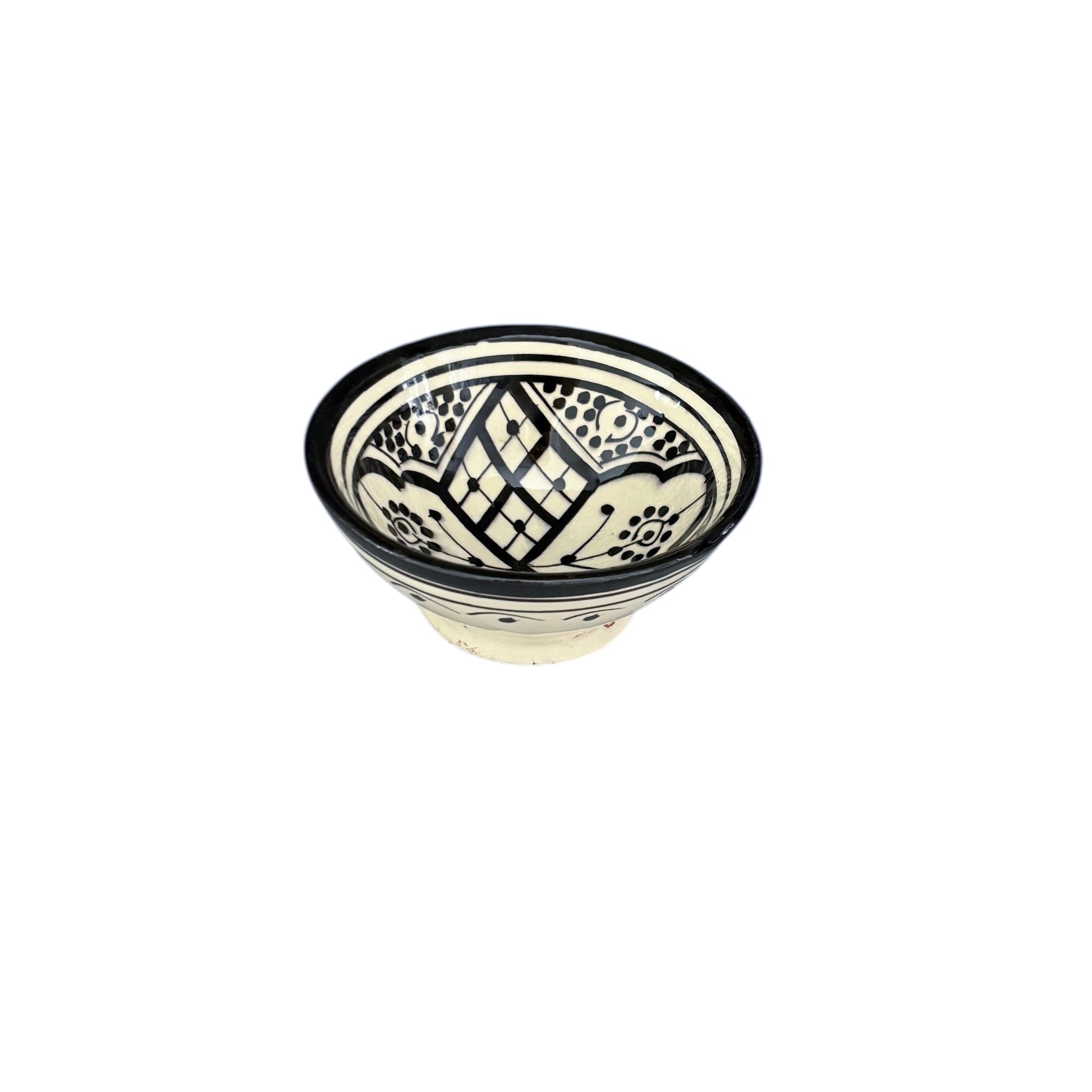 Vit handgjord marockansk skål med svarta orientaliska detaljer.