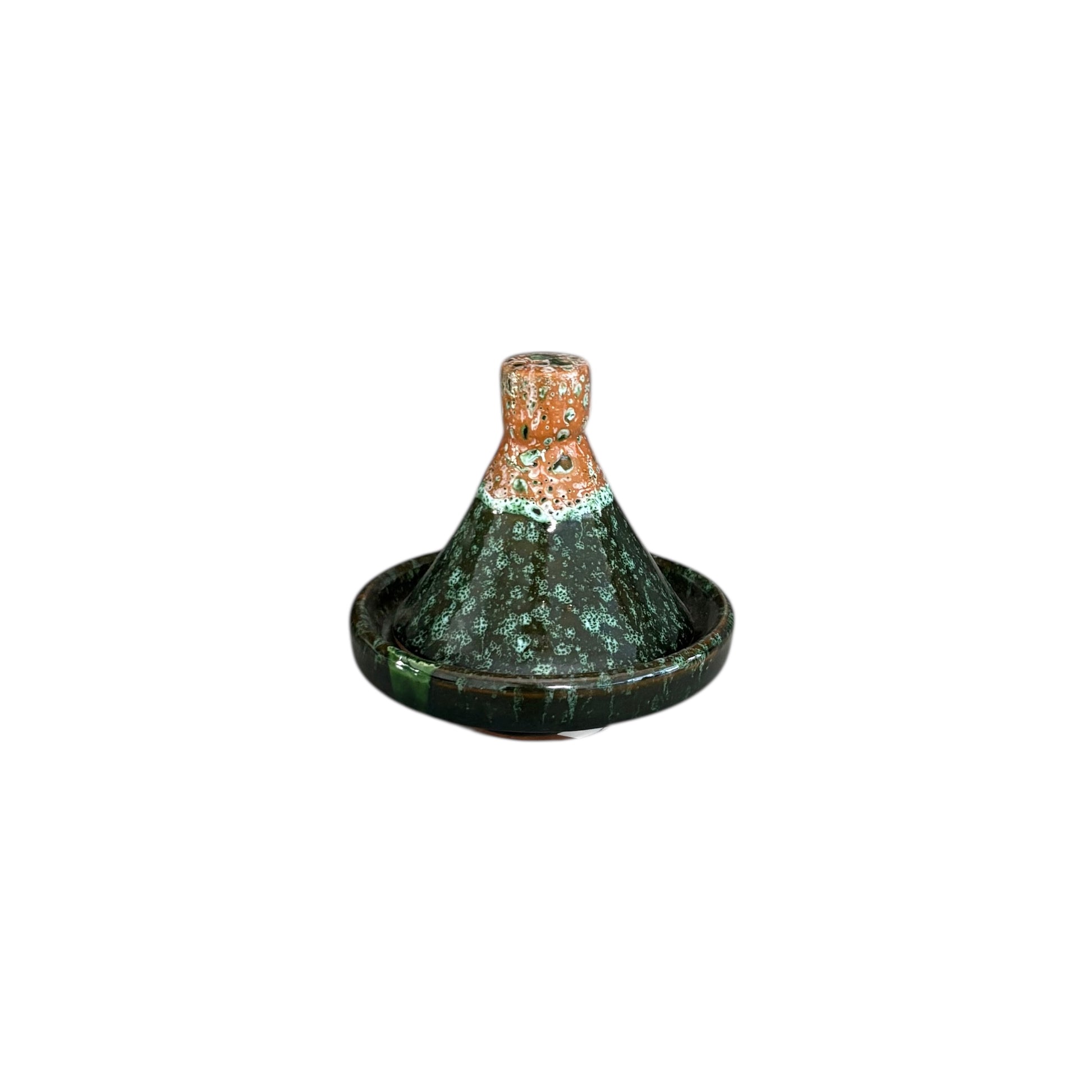 Mindre tagine som kan användas till diverse innehåll såsom vitlök, oliver etc. Grön med roströda detaljer.