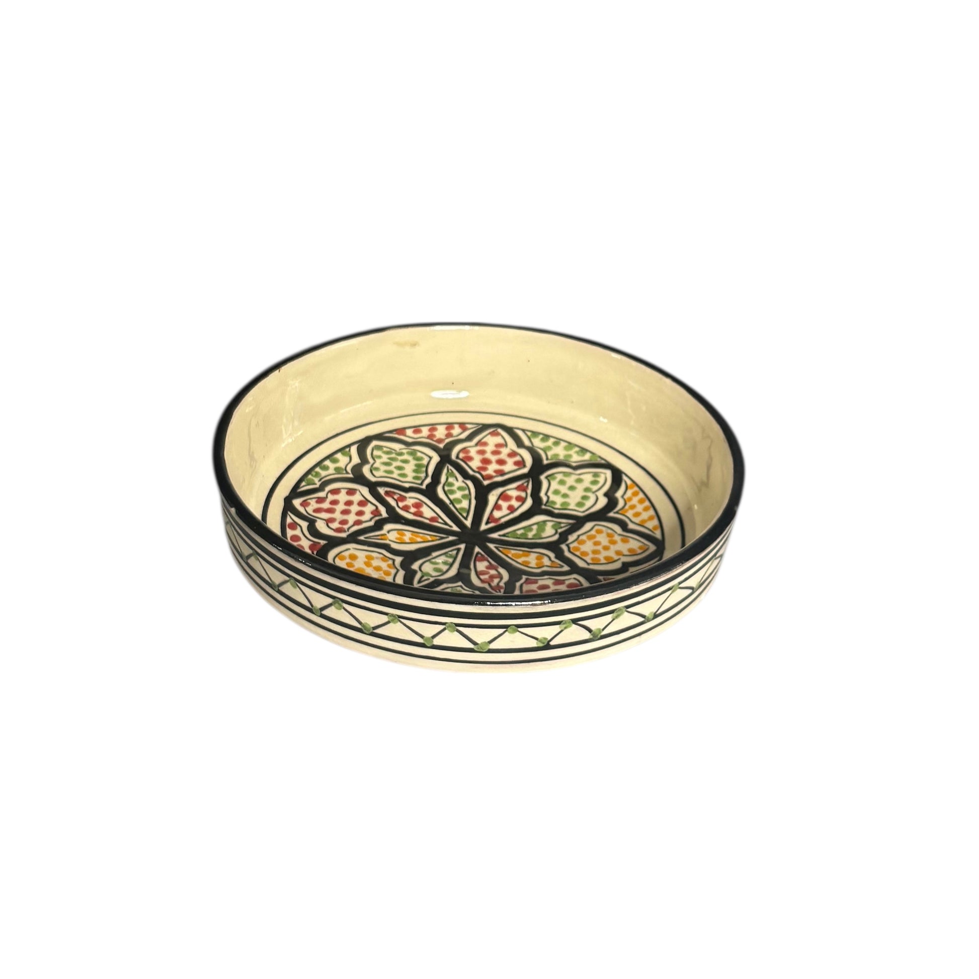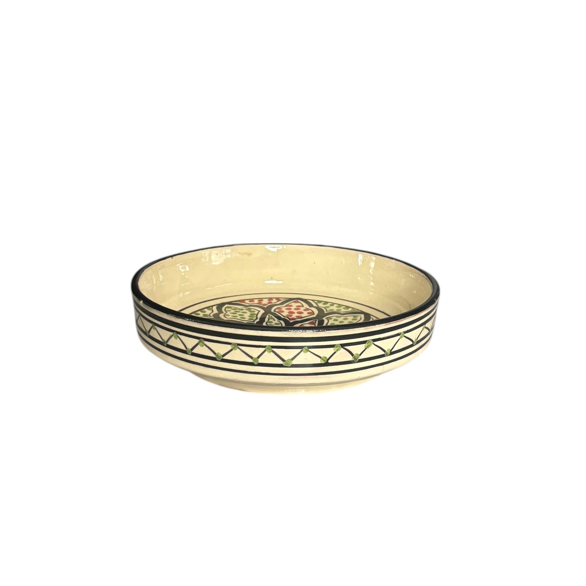 Handgjord marockansk tallrik med högre kant i vitt med svarta, gula, gröna och röda detaljer. Perfekt för att servera couscous eller liknande.