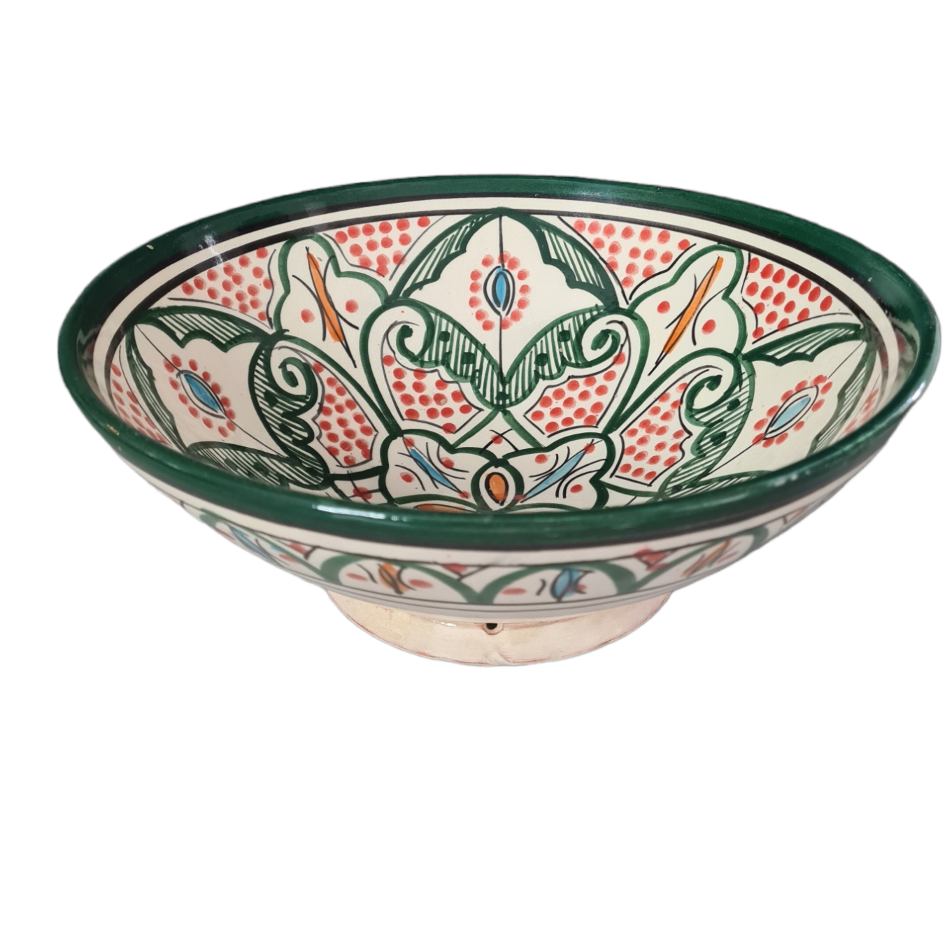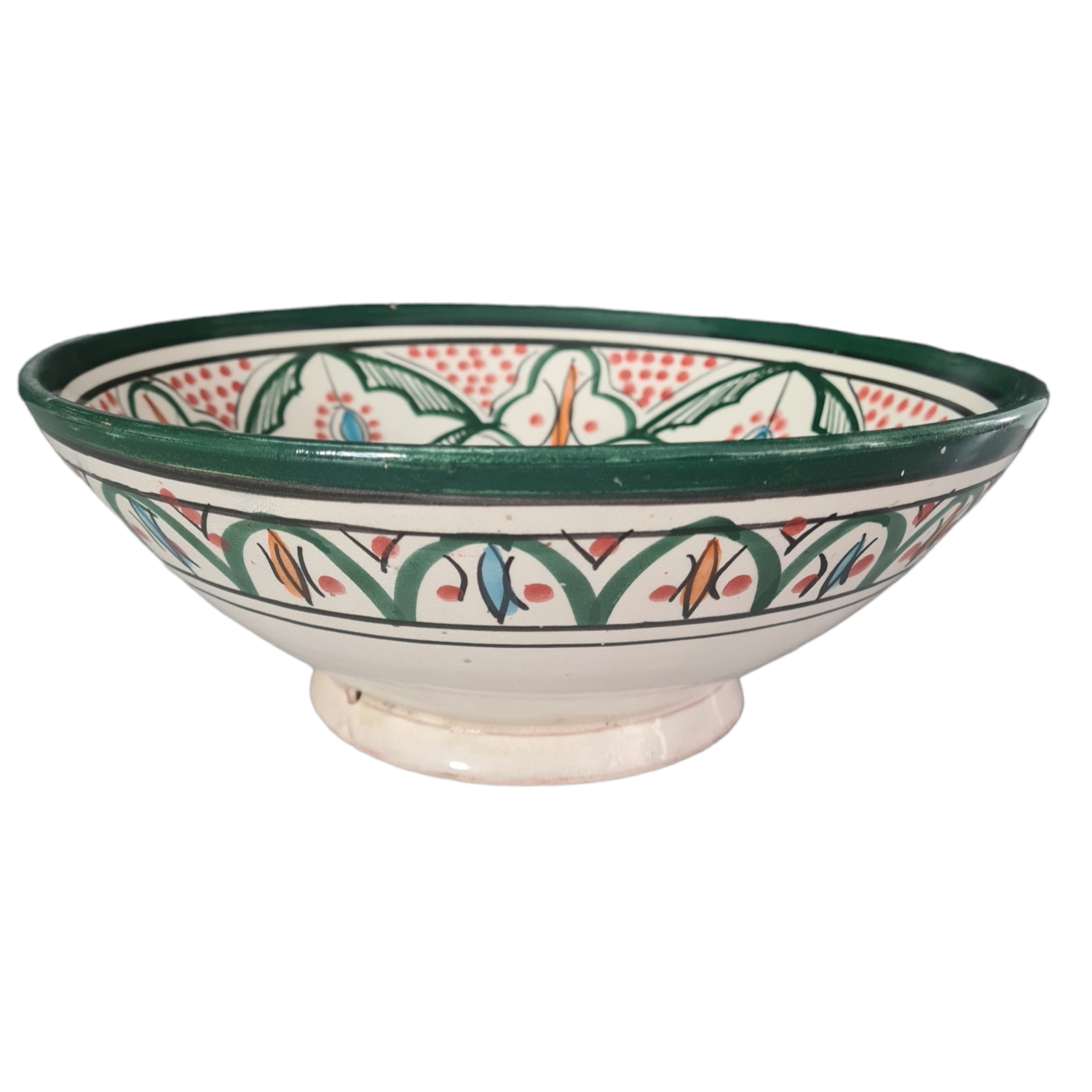 Handgjord skål i skogsgröna nyanser med röda, blå och orangea inslag.