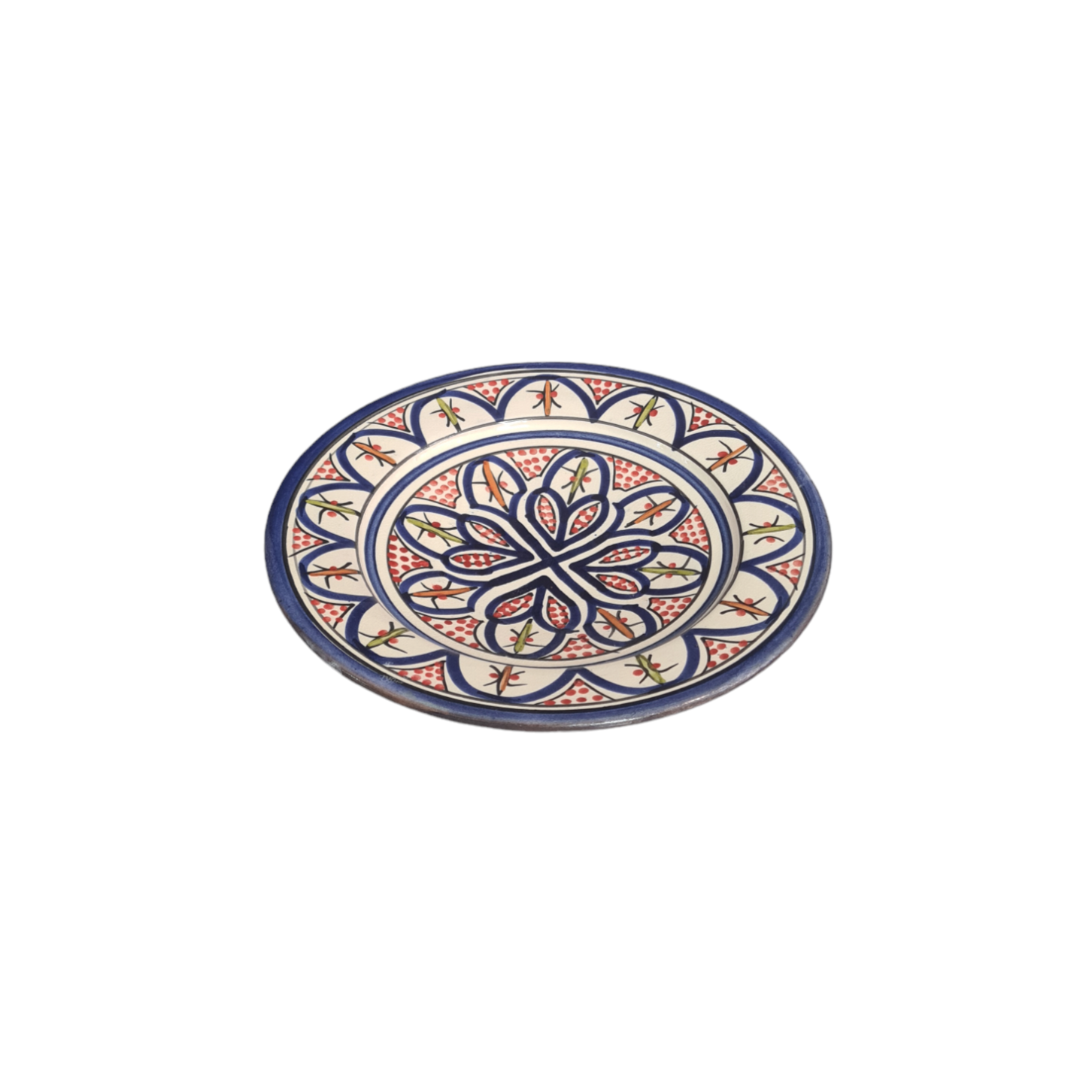 Marockansk handmålad assiett i blått med röd/orangea detaljer.