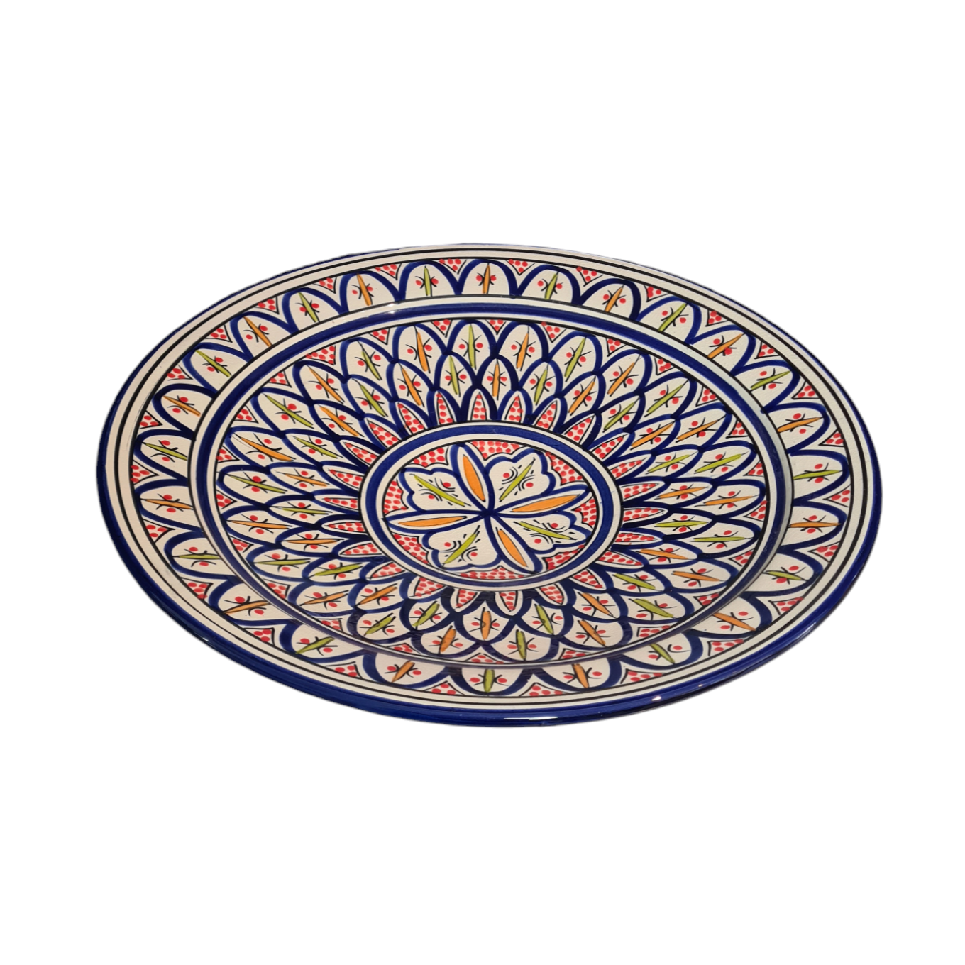 Stort fat I blå/vitt med gröna och röda detaljer.