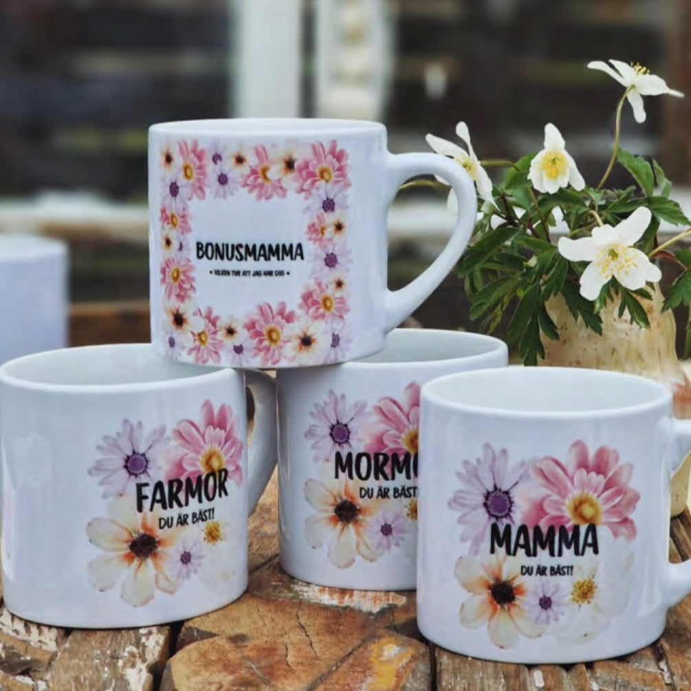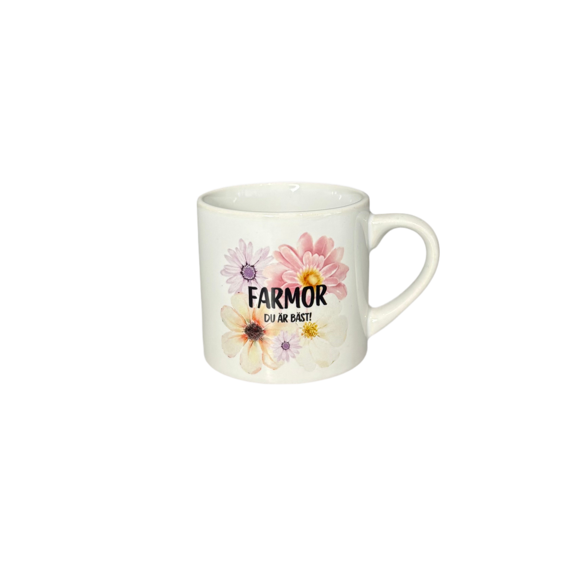 Kopp i romantiska blommönster med texten Farmor, du är bäst.
