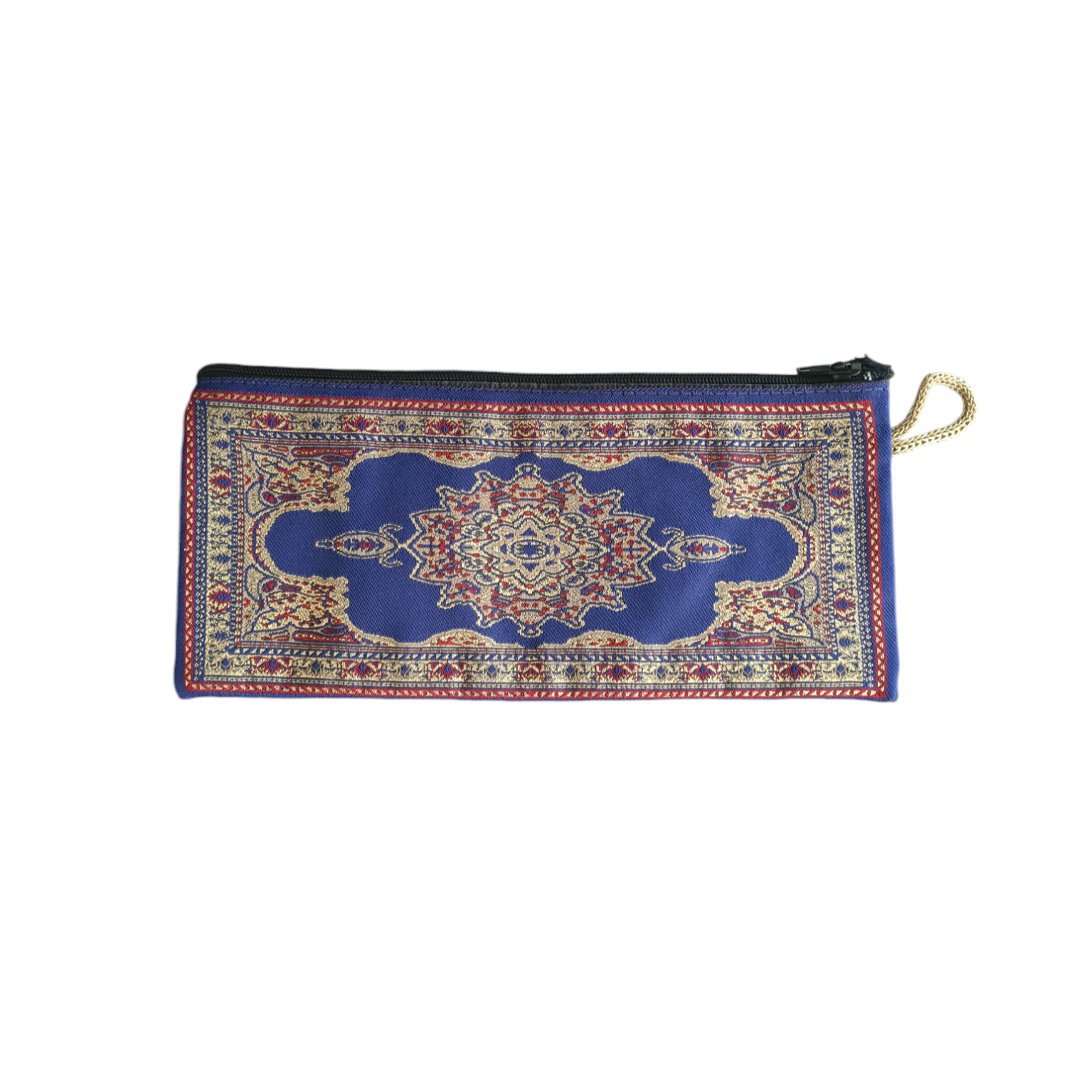 Blå necessär med guldiga och röda orientaliska mönster handgjord i Marocko.