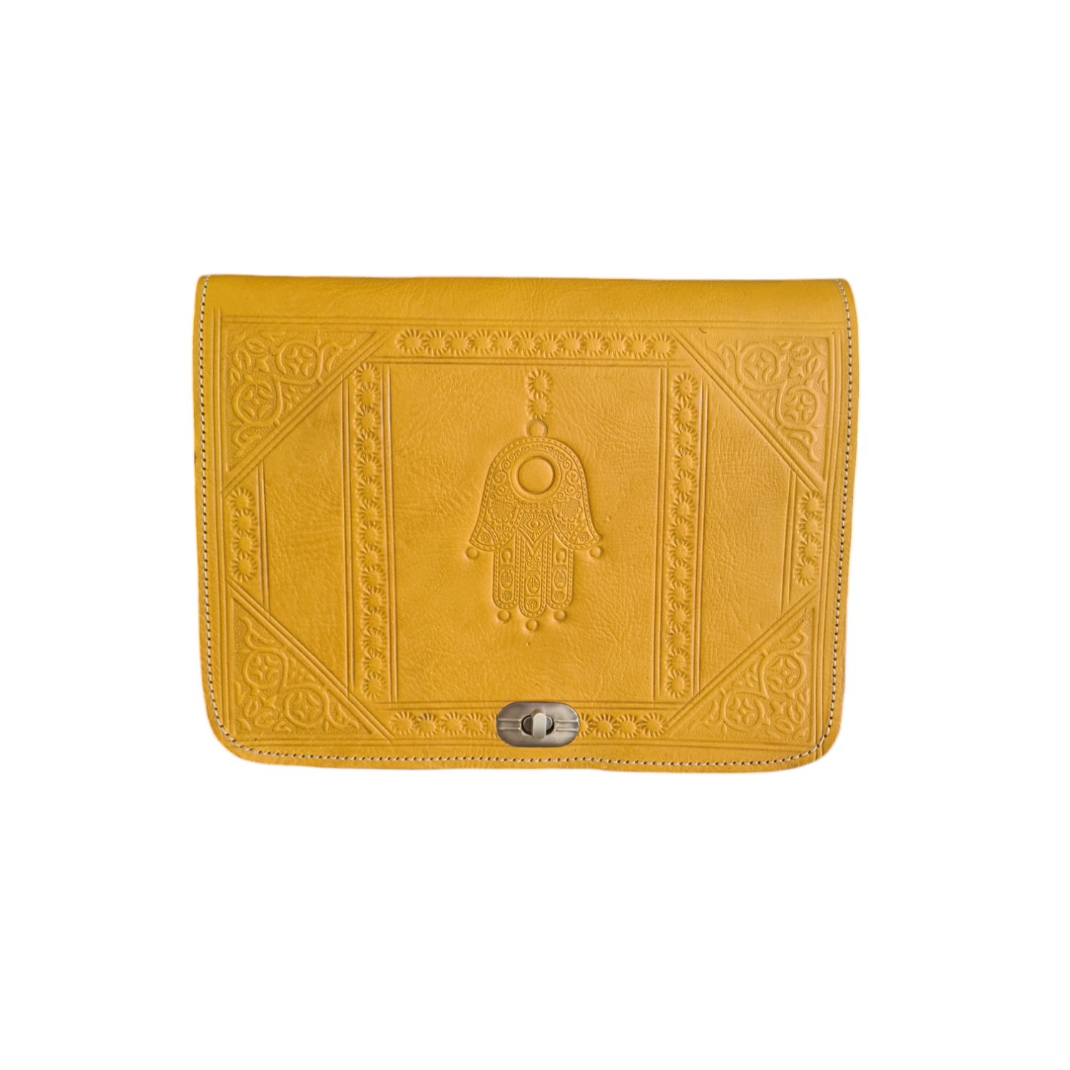Gul väska med mönster av Fatimas hand i äkta läder handgjord i Marocko.