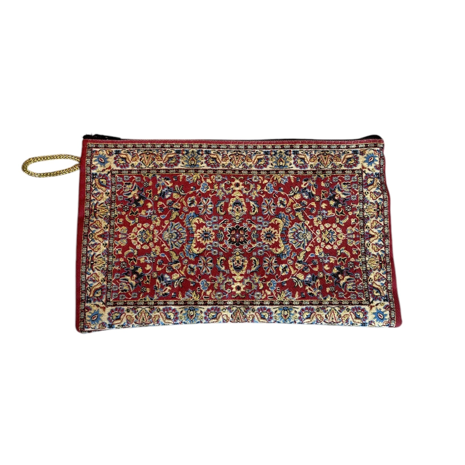 Röd necessär med guldiga och blåa orientaliska mönster handgjord i Marocko.