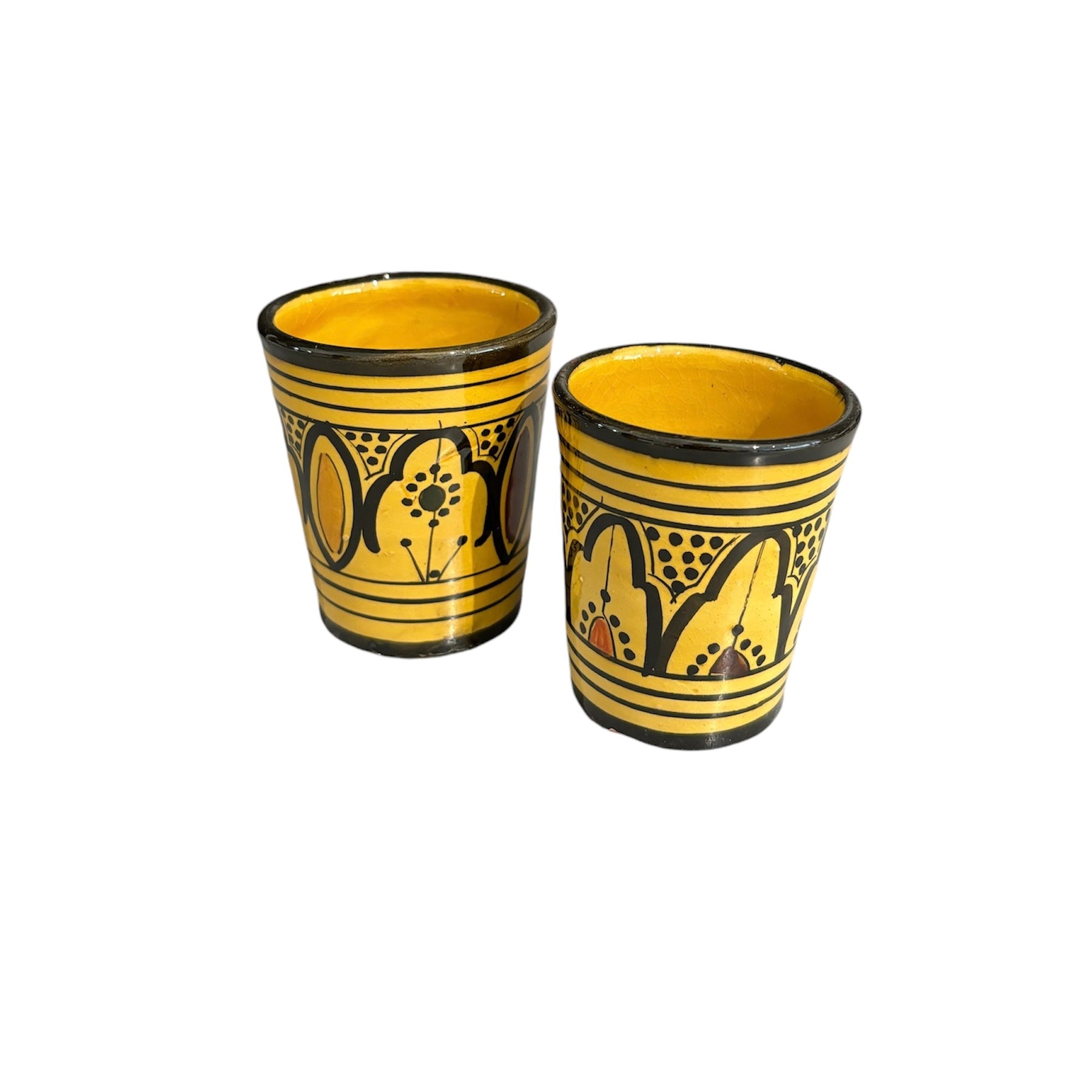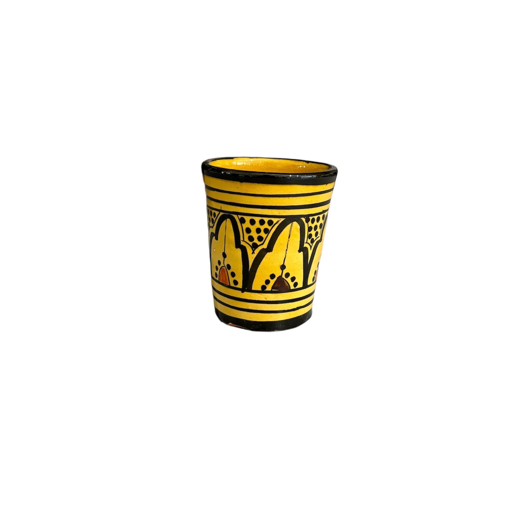 Gul orientalisk kaffekopp i något mindre design med svarta detaljer.