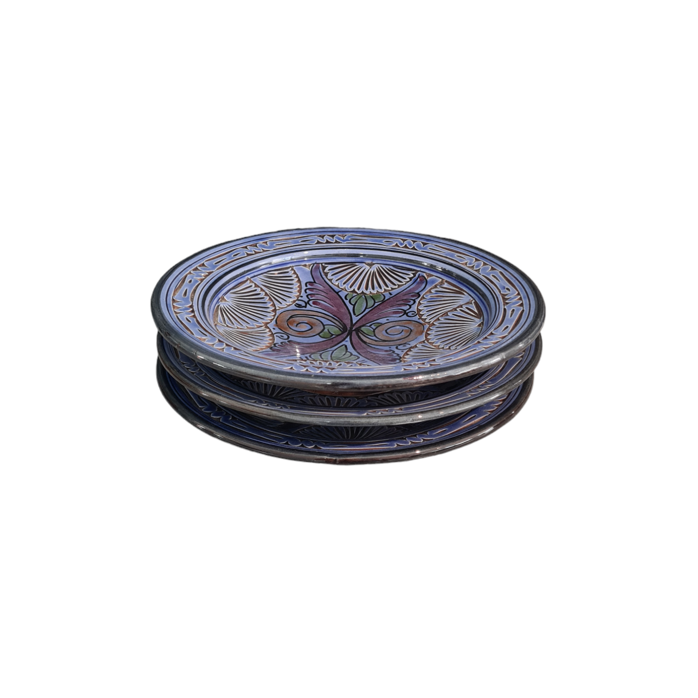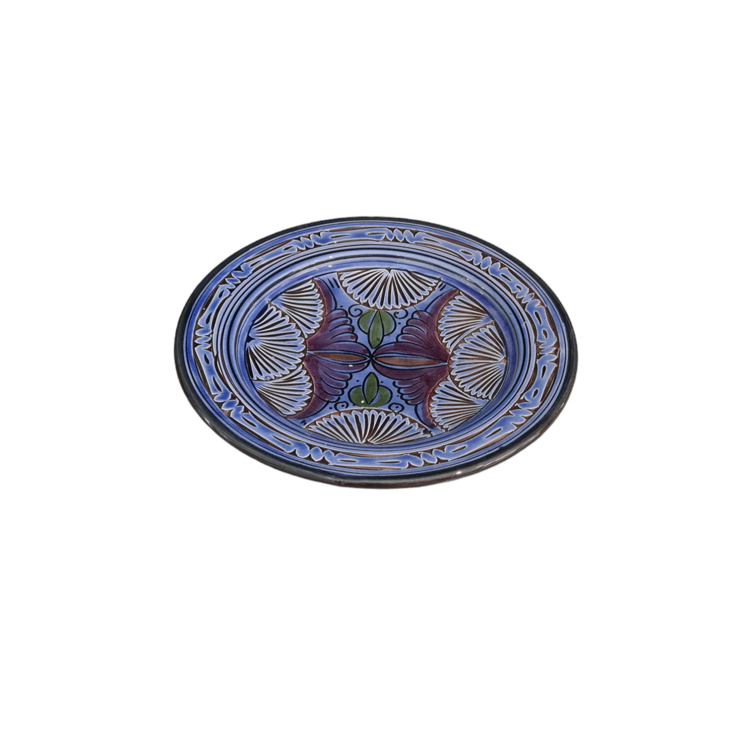 Blått marockansk tallrik i handgjord, målad och inristad keramik.