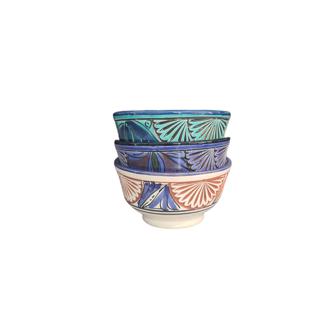 Marockansk vit skål i handgjord, målad och inristad keramik med bruna, blåa och orangea detaljer.
