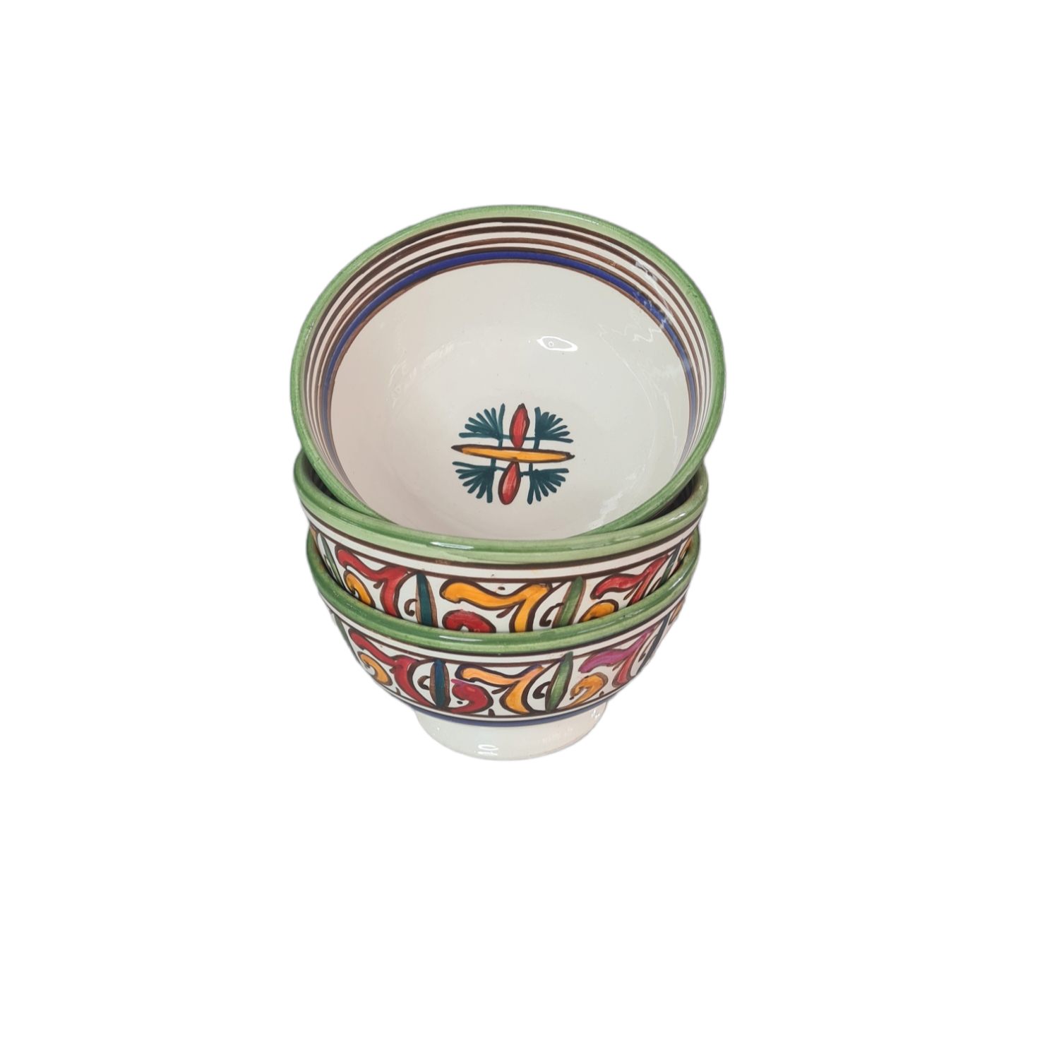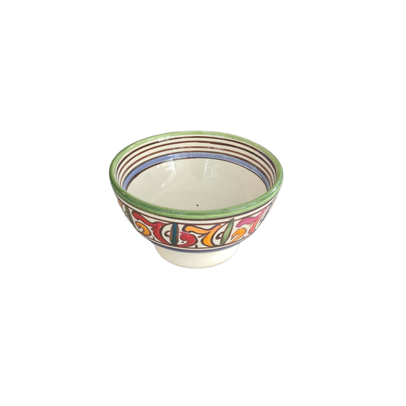 Handgjord marockansk skål i skogsgröna nyanser och färgglada detaljer.