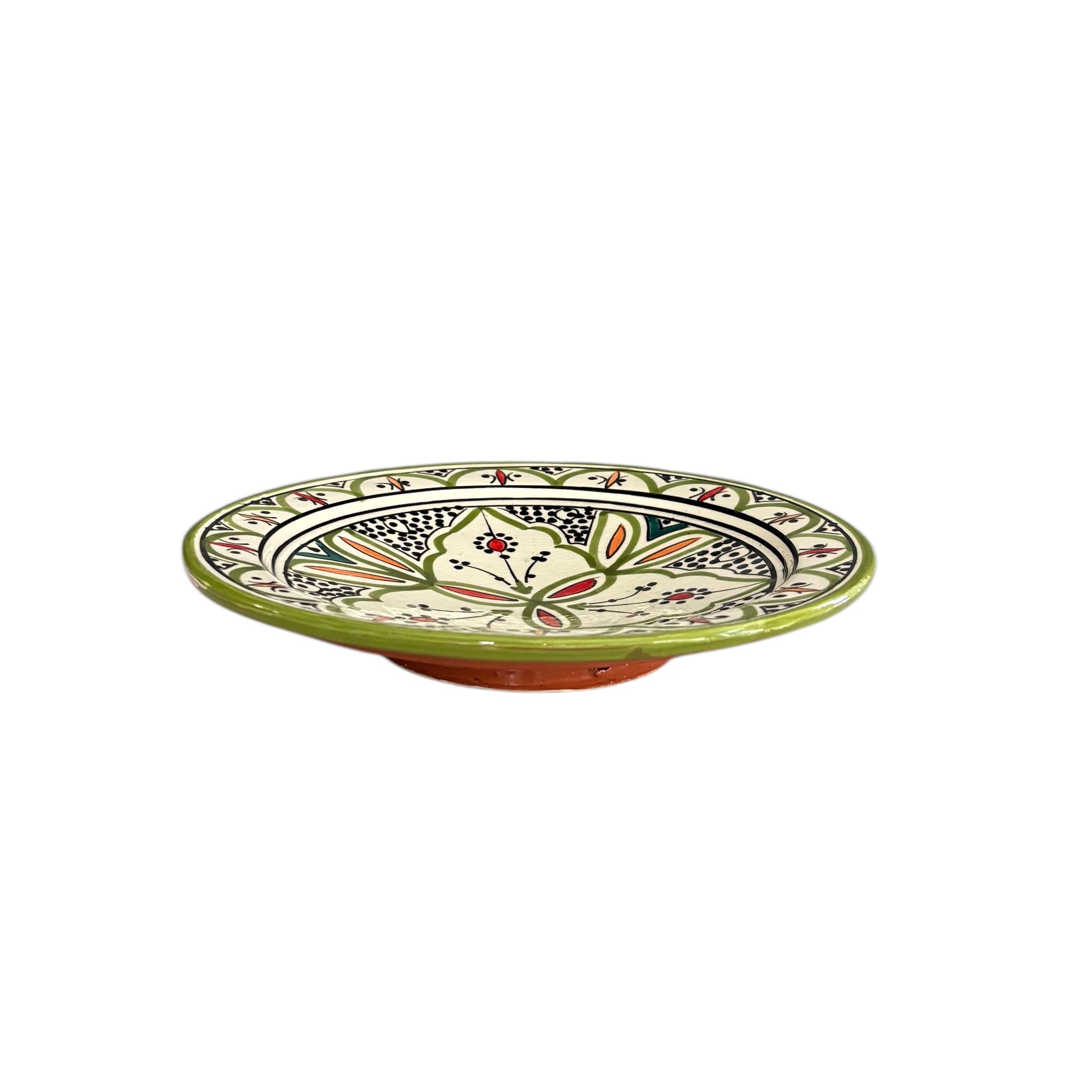 Handgjord större tallrik från Marocko i skogrön färg med orangea, röda och svarta detaljer.