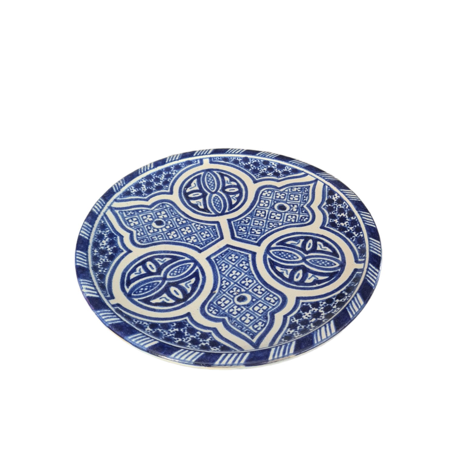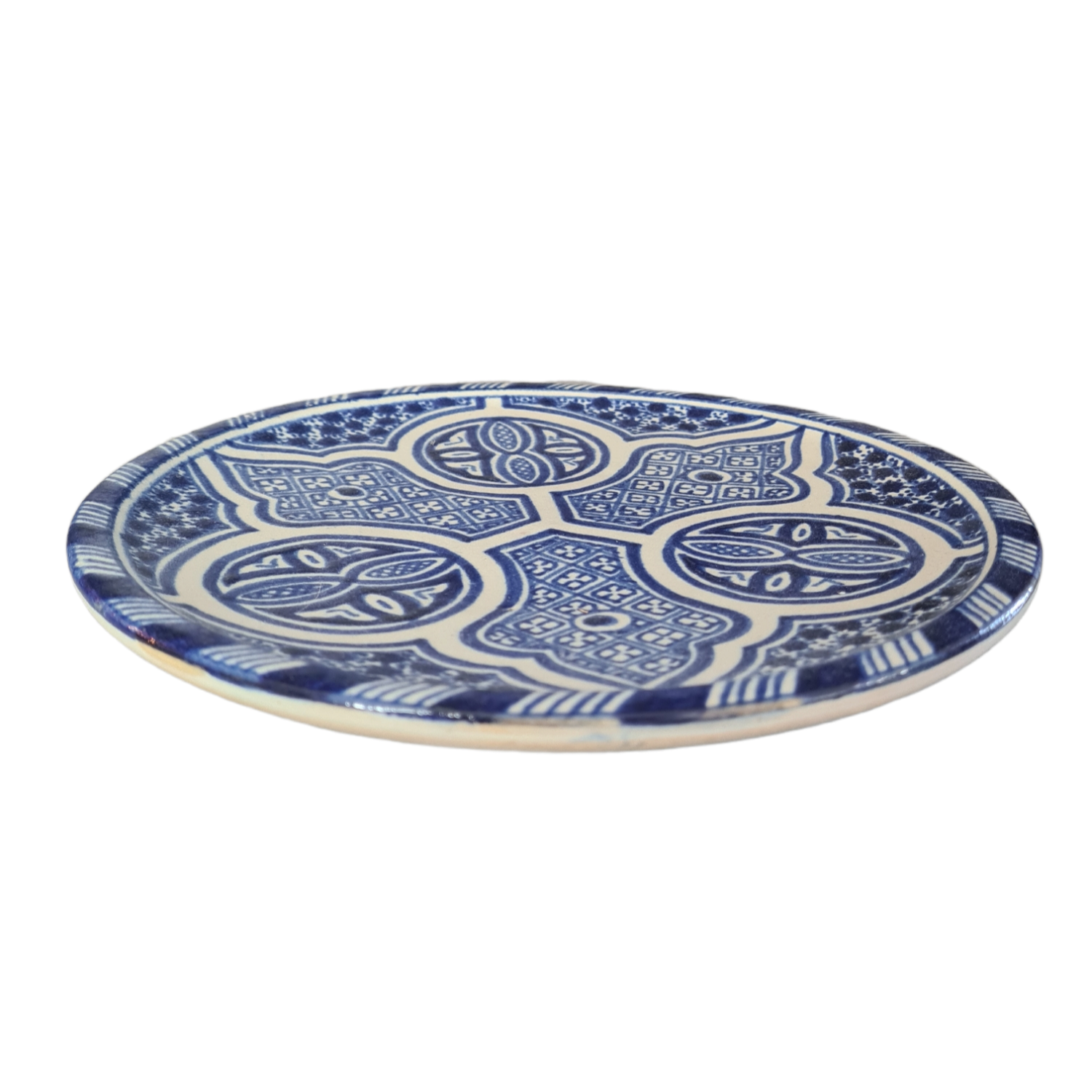 Handgjord marockansk mindre tallrik med havsblåa detaljer.