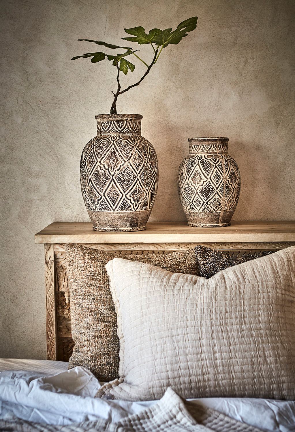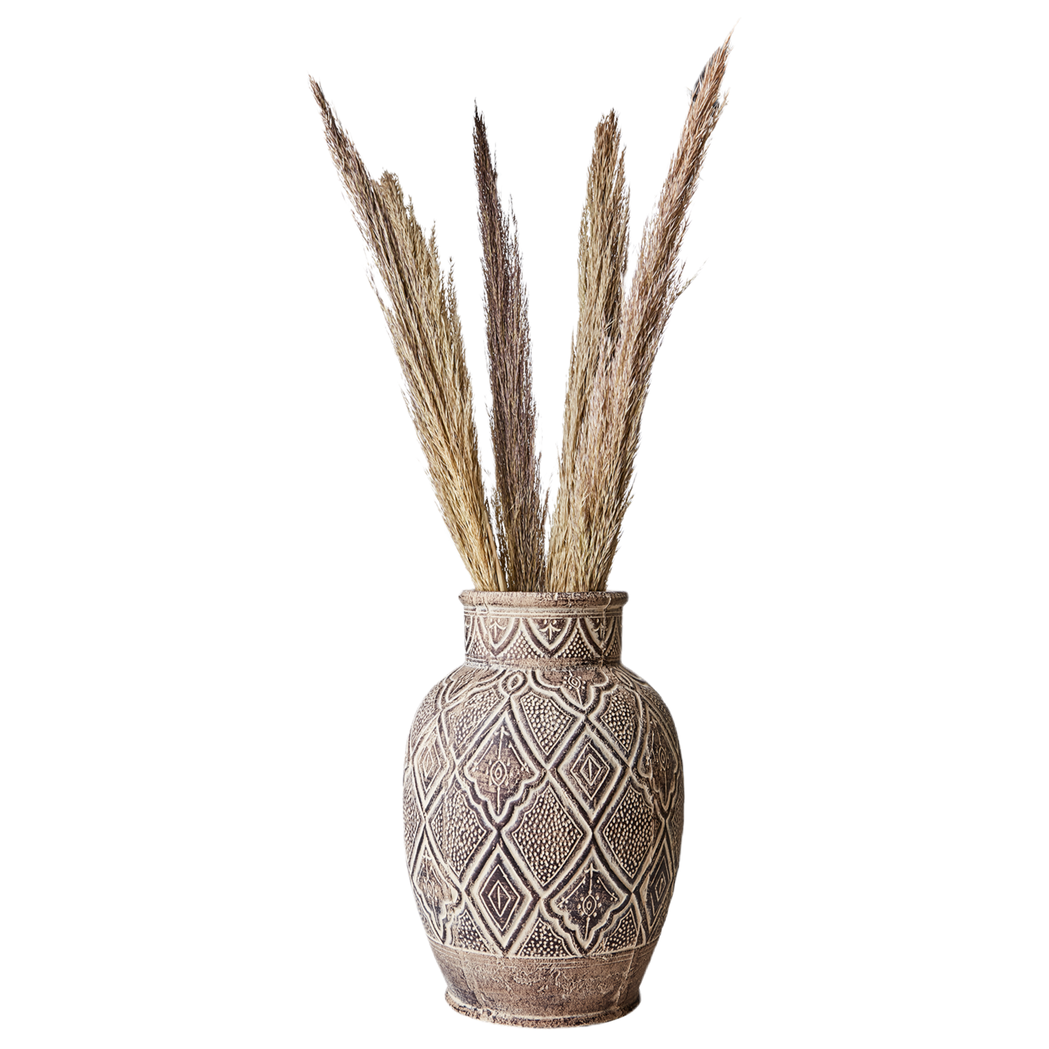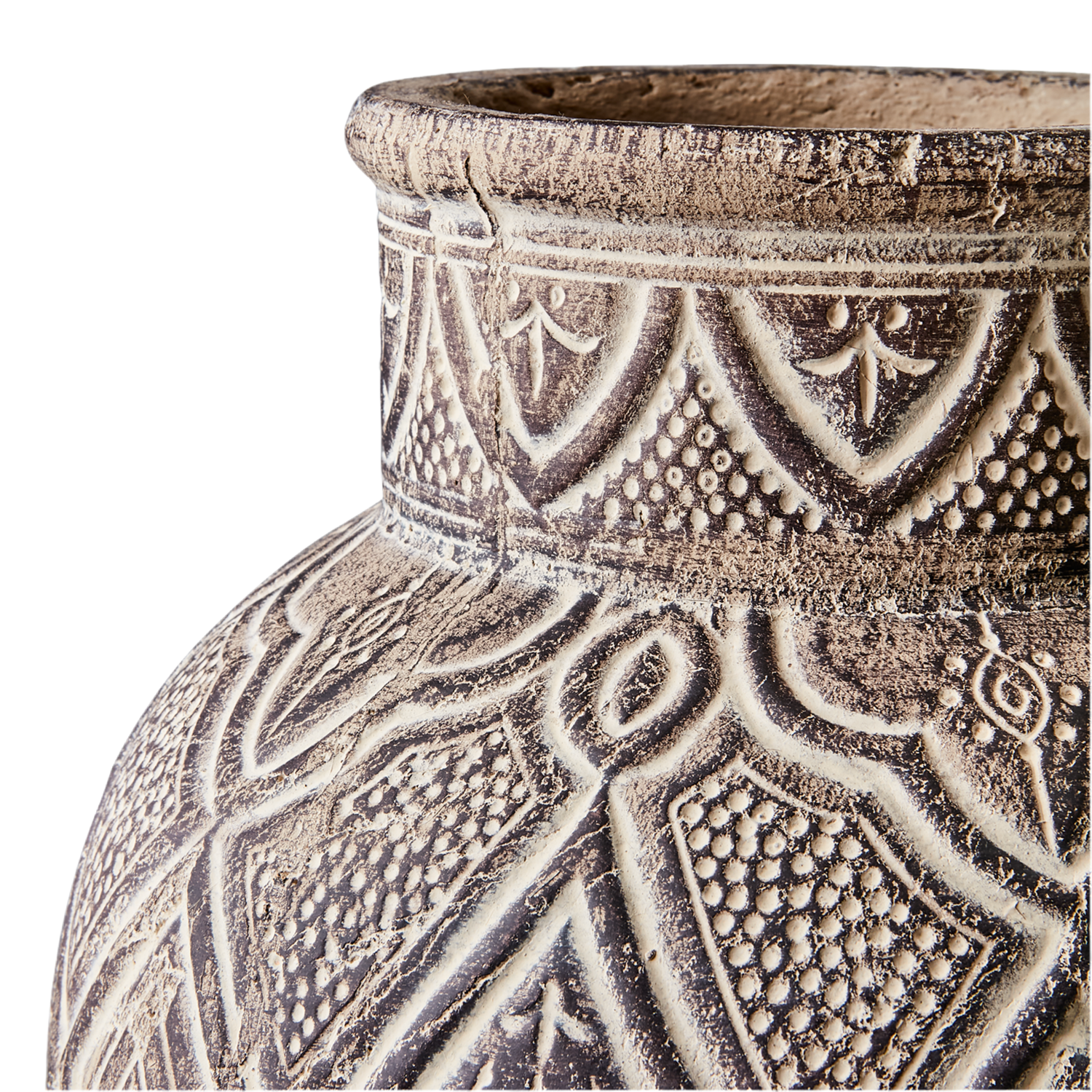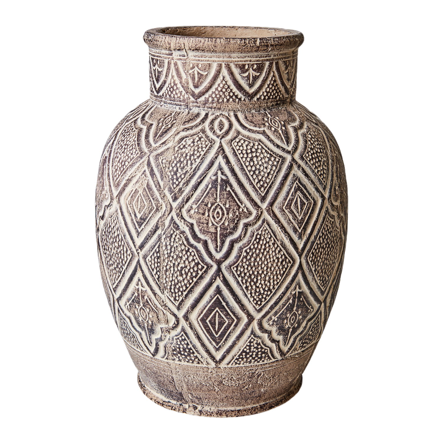 Hög urna i ljusbrun terrakotta med ett vackert marockanskinspirerat mönster. Fin att använda som vas till torkade blommor eller dekorationsväxter men är även en vacker inredningsdetalj utan innehåll.