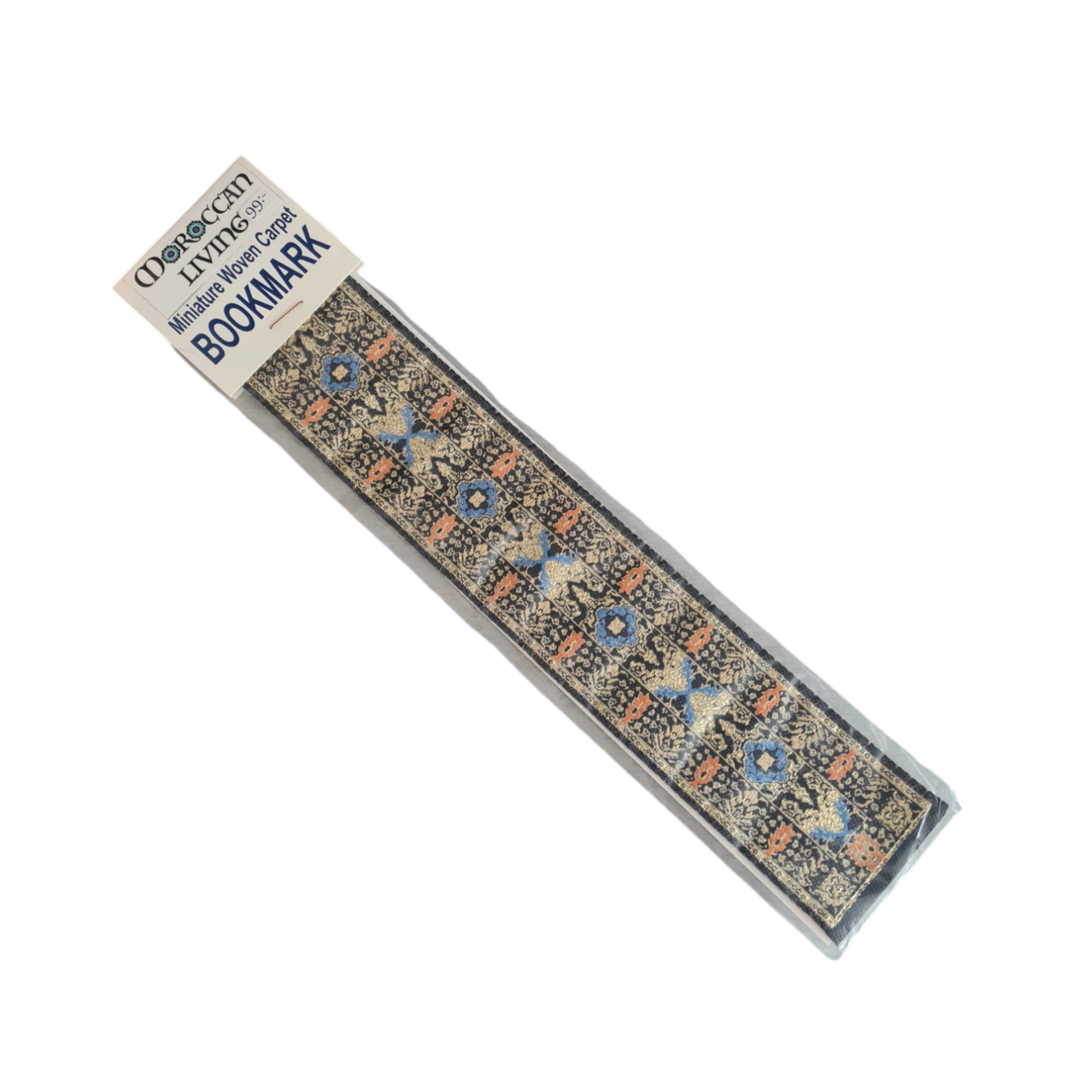 Svart bokmärke i tyg med guldiga och orangea orientaliska mönster handgjord i Marocko.