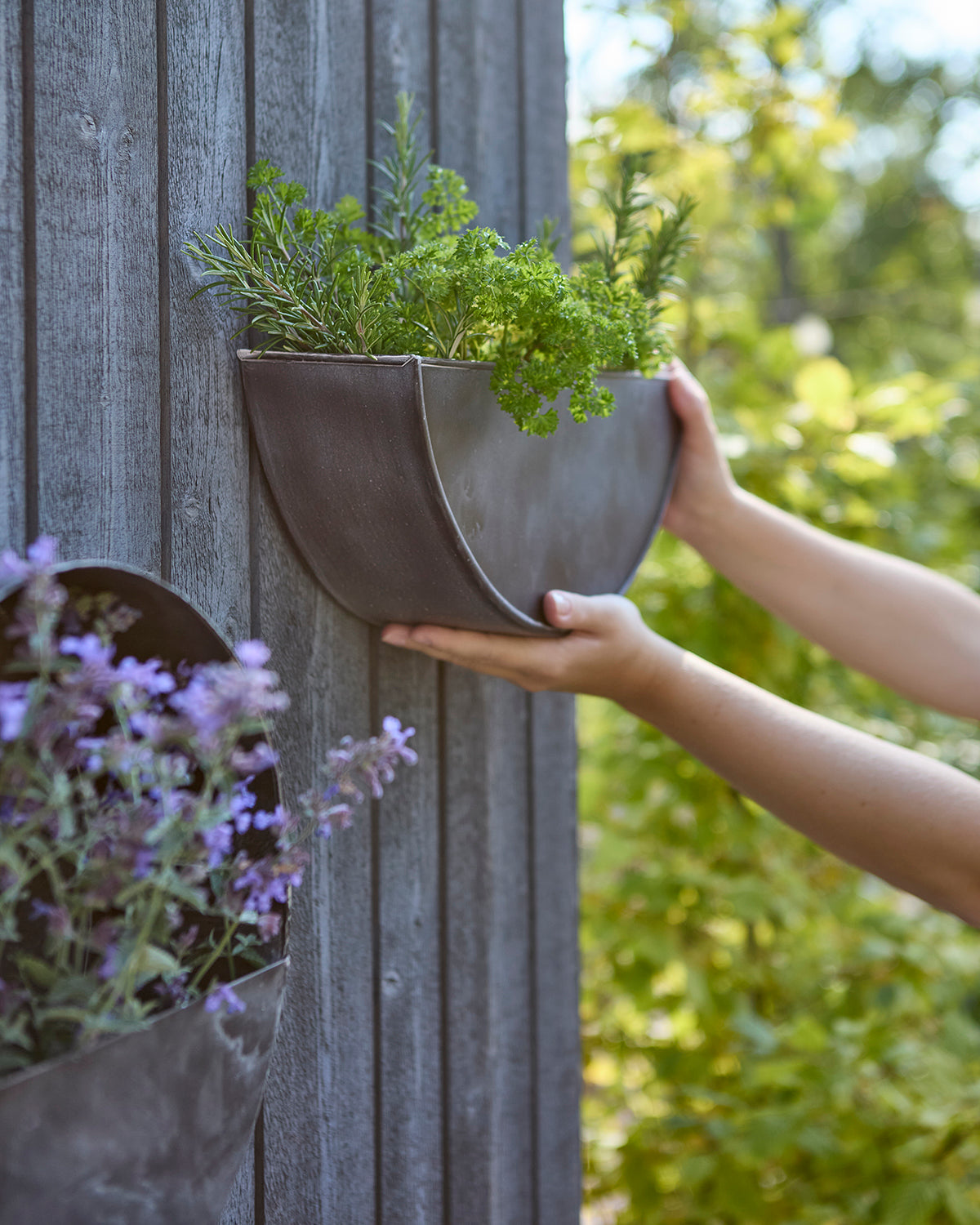 Väggkruka i galvaniserat järn i mörkgrå nyans för en stilren look. Rostskyddad yta för hållbarhet och lång livslängd. Perfekt för att skapa dekorativa väggar med växter.